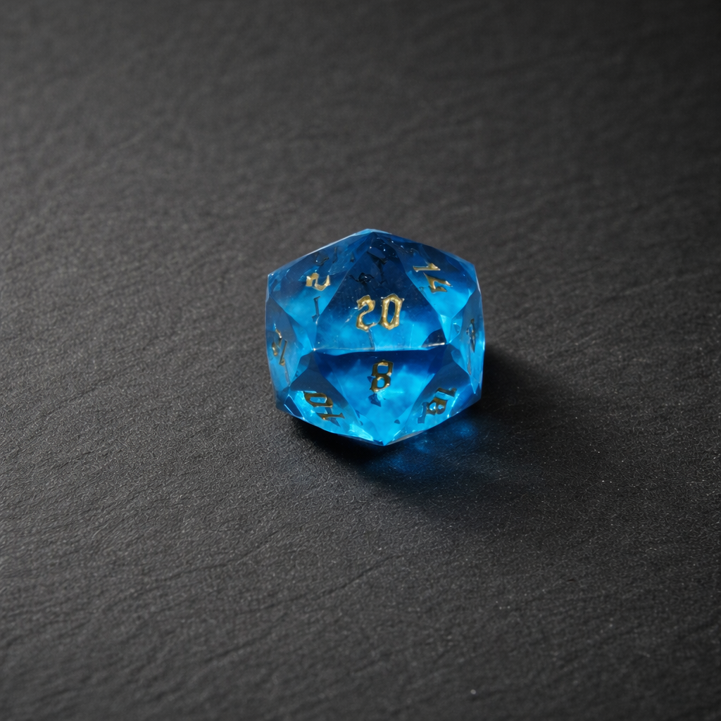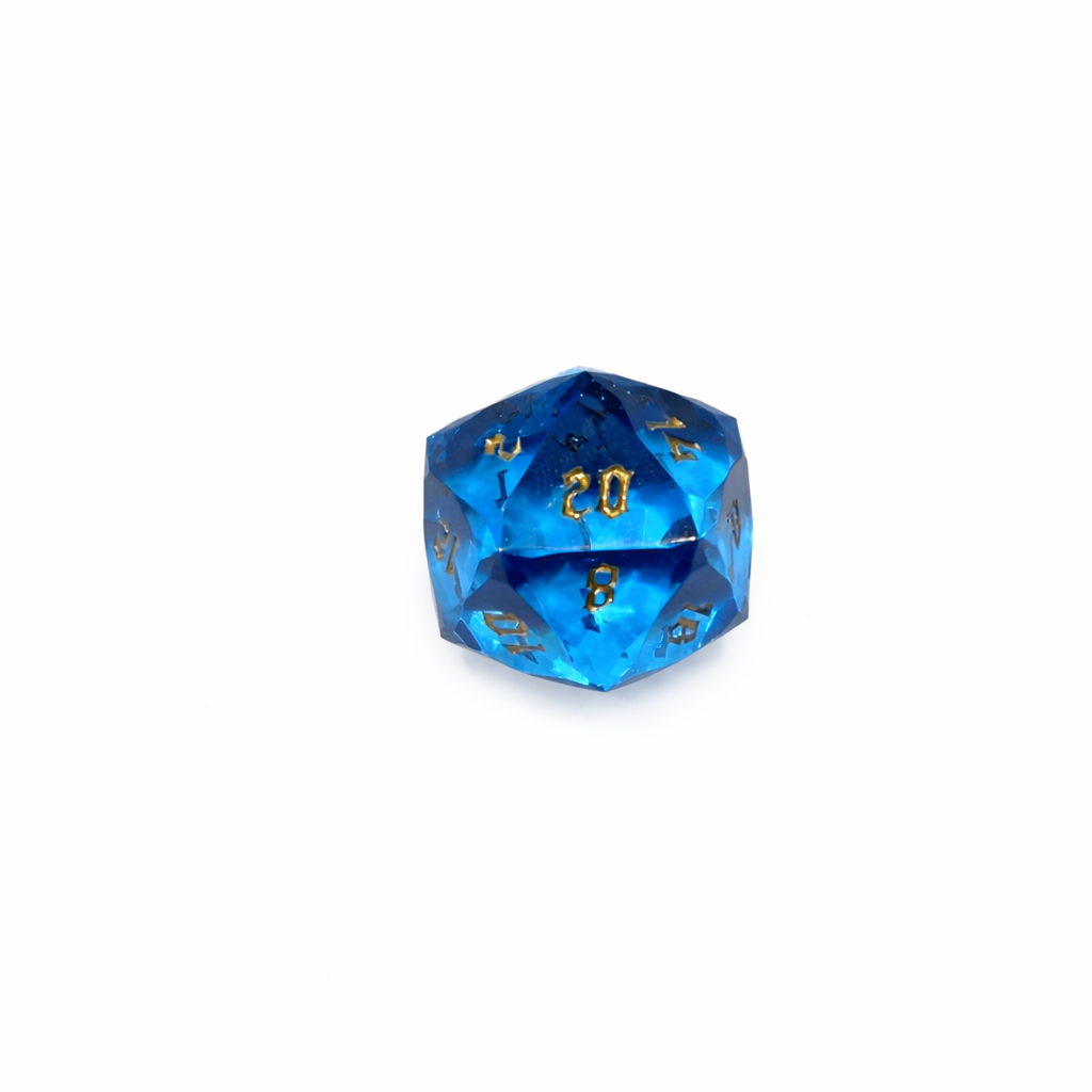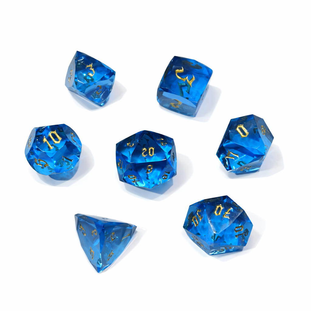 Clear, faceted resin shaped with sharp gemstone cuts gives each die the feeling of a cut sapphire suspended in time. The blue is deep but luminous, shifting between ocean depth and arcane glow depending on the light. Inside, subtle crystalline flashes catch and scatter illumination like trapped starlight. Gold numbering burns warmly against the cool body, creating that delicious contrast of fire within ice.