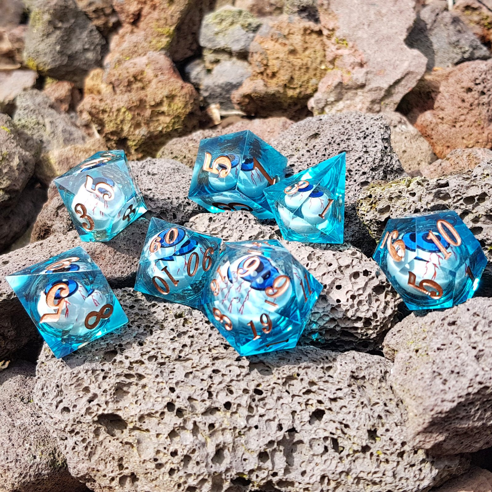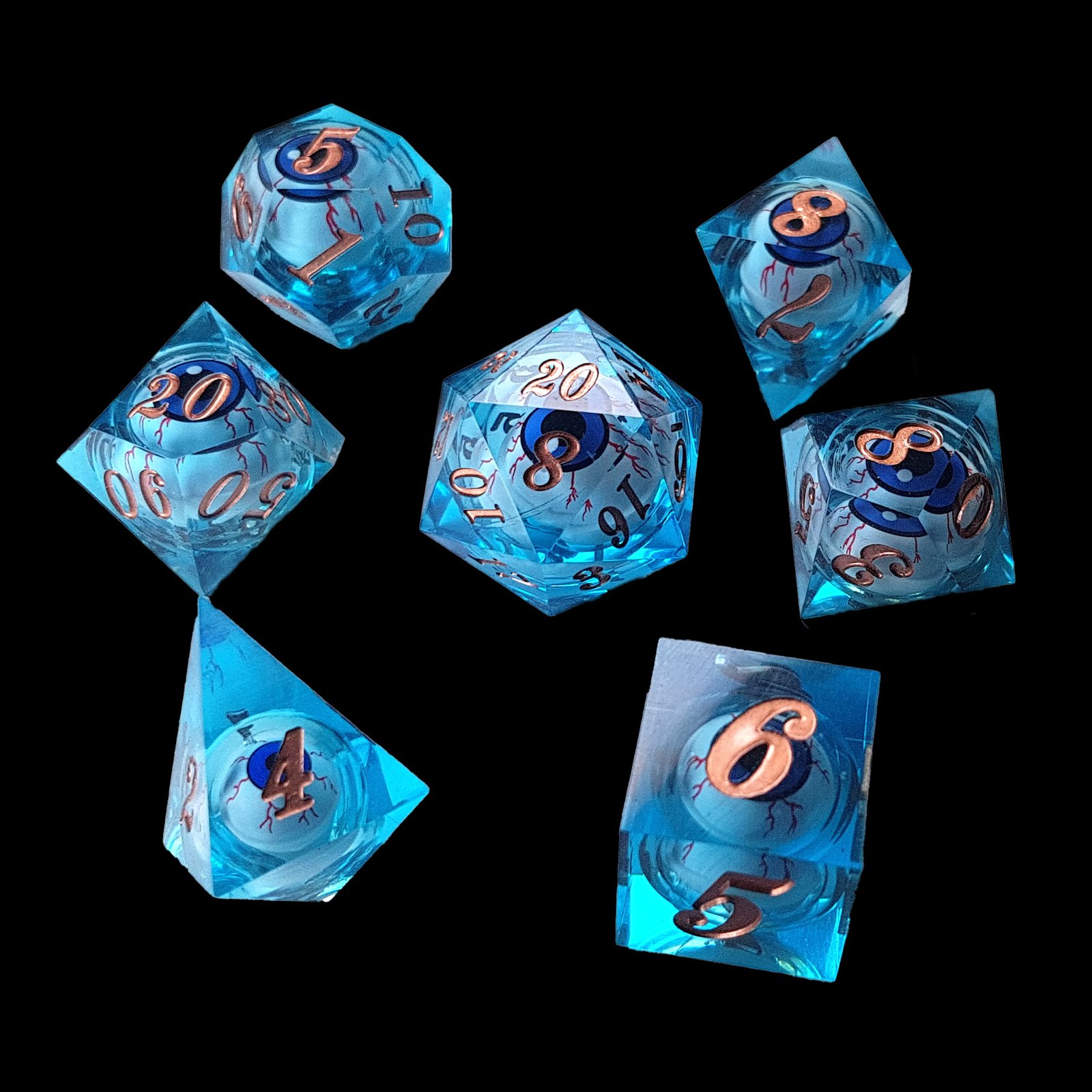 Blue Eye of Wisdom – Sharp Resin Liquid Core DnD Dice Set