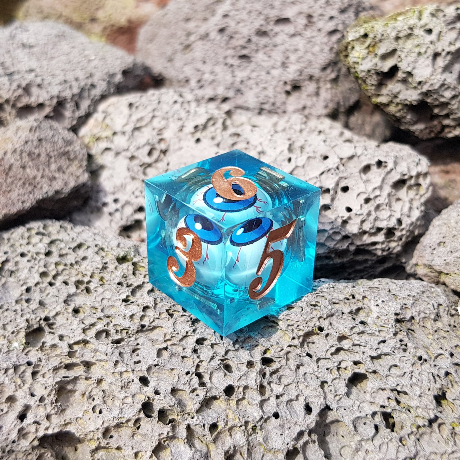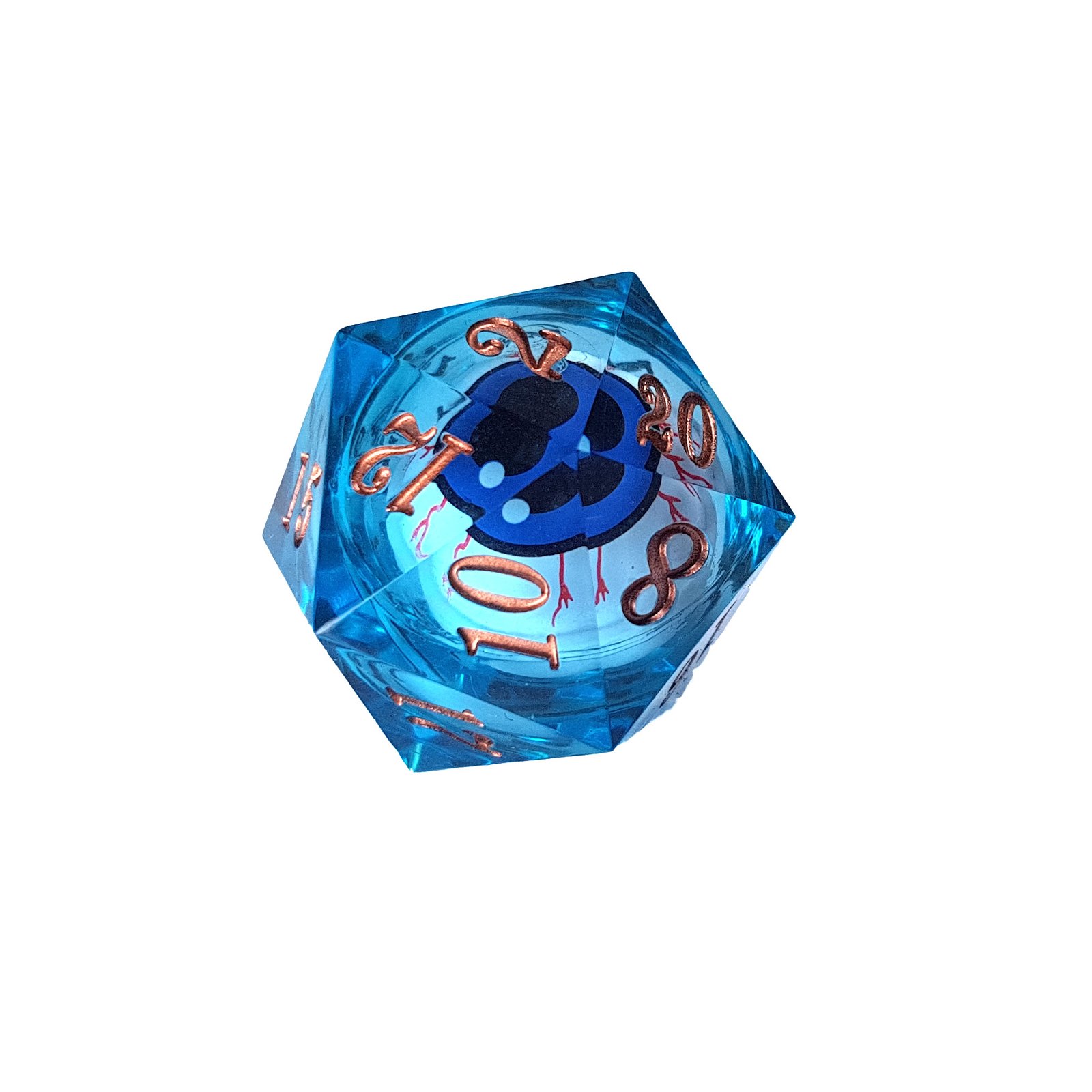 Suspended at the heart of every die lies a liquid core crafted in the shape of a watchful eye. It turns and shifts with each movement, following the roll as if tracking the threads of fate themselves. Its presence is both mysterious and comforting, a silent companion guiding each decision made at the table.