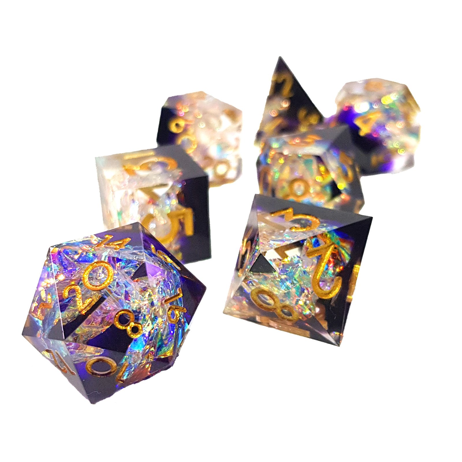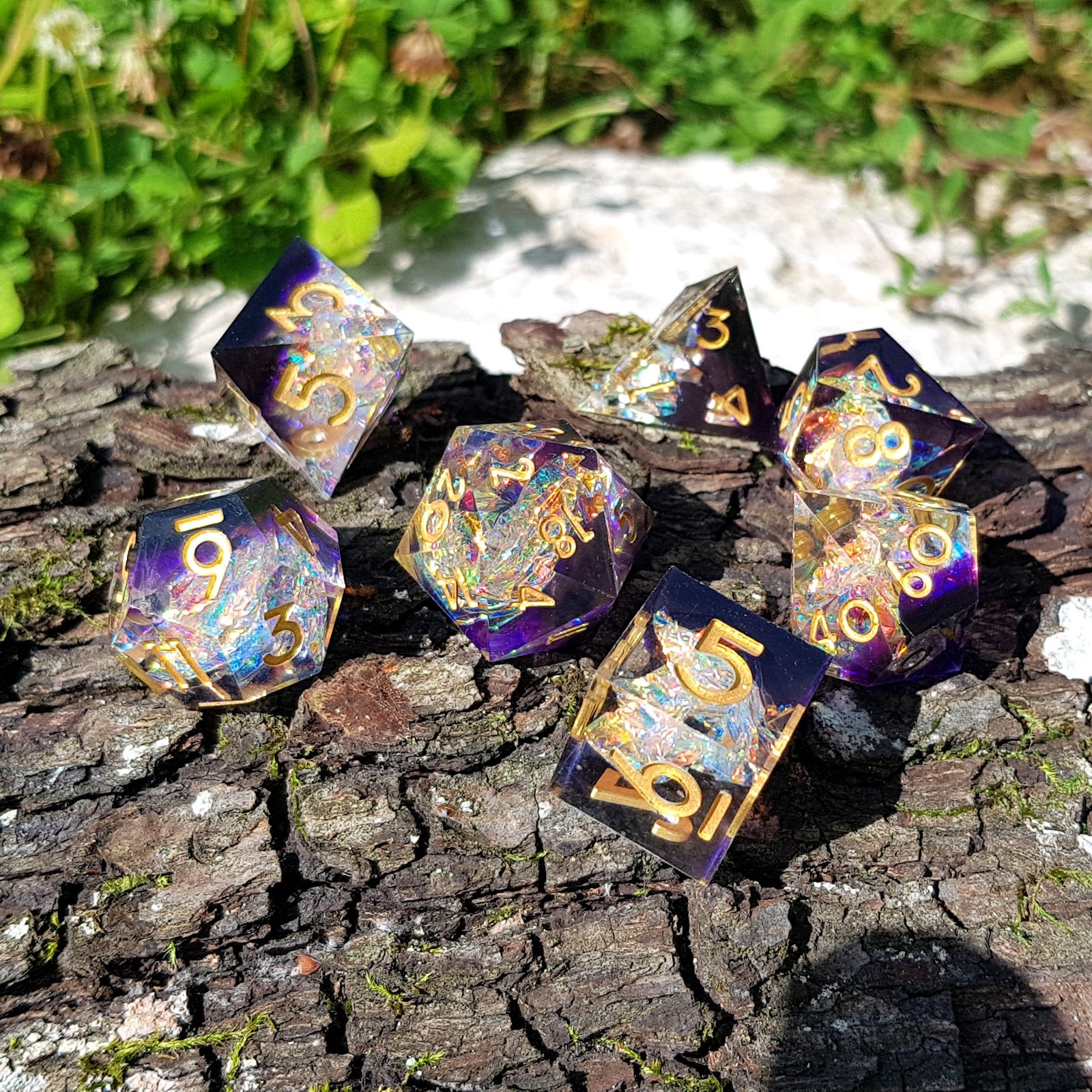 Includes: D4, D6, D8, D10, D%, D12, D20, each glimmering with unique astral flakes that shine brighter the longer they rest beneath the sun or candlelight.