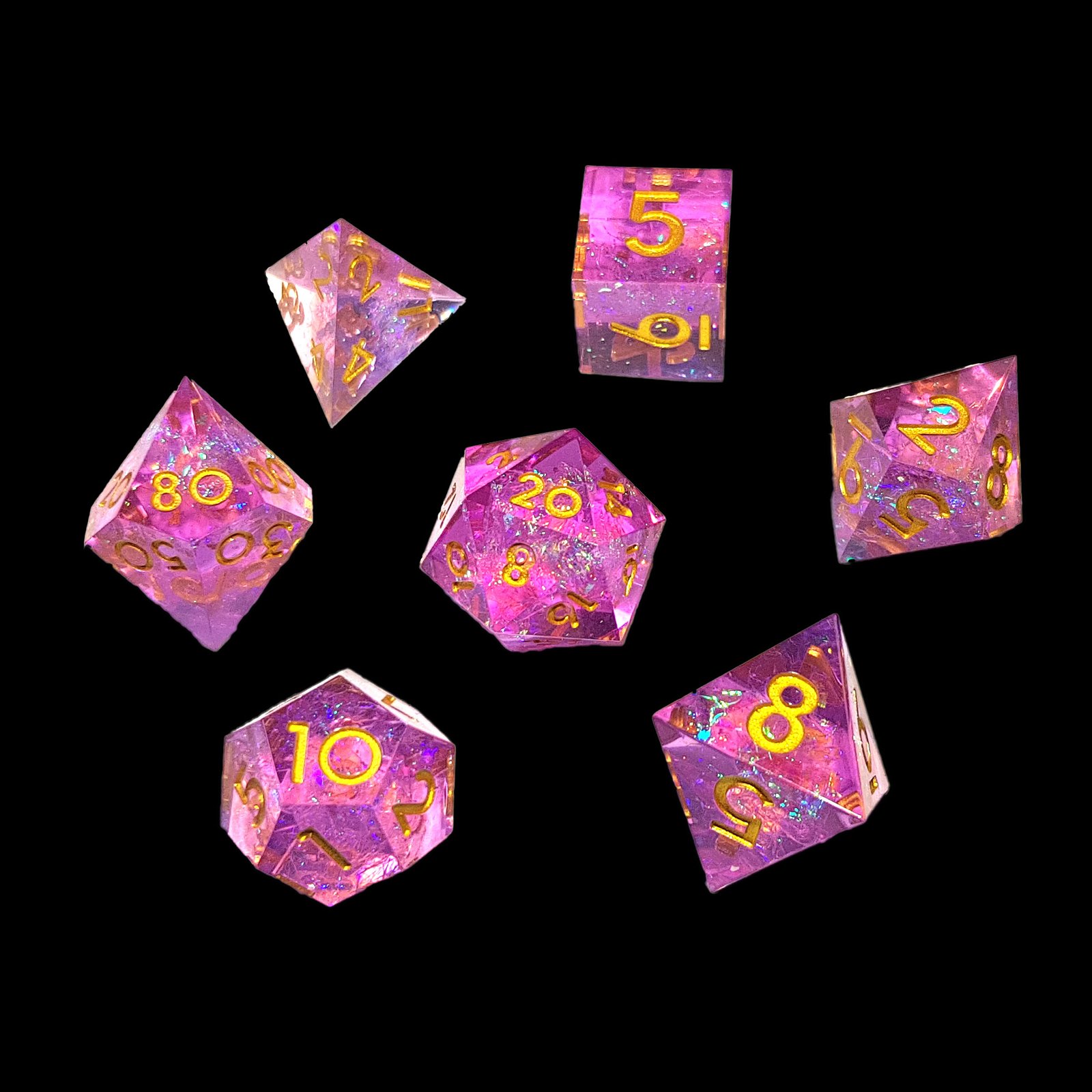 Includes: D4, D6, D8, D10, D%, D12, D20, each shimmering with uniquely tinted dawnlight flakes that glow even brighter under natural sunlight.