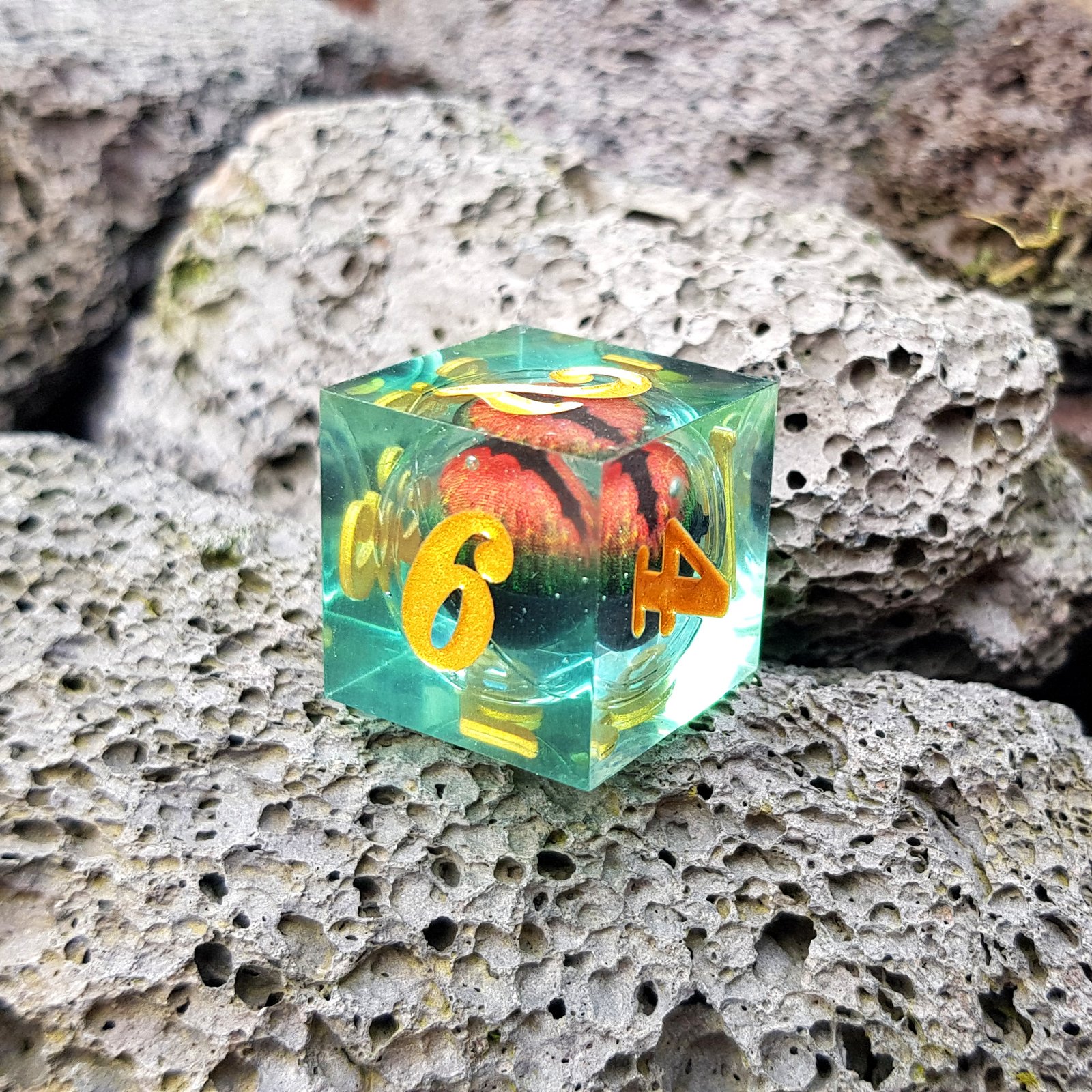 At the heart of every die churns a liquid core shaped like a dragon’s blood-red eye. It swirls with blazing hues of crimson, amber, and shadowed black, shifting with the same unpredictable intensity as a dragon stirred from slumber. With every movement, the eye follows the roll—alive, alert, and brimming with restrained wrath.