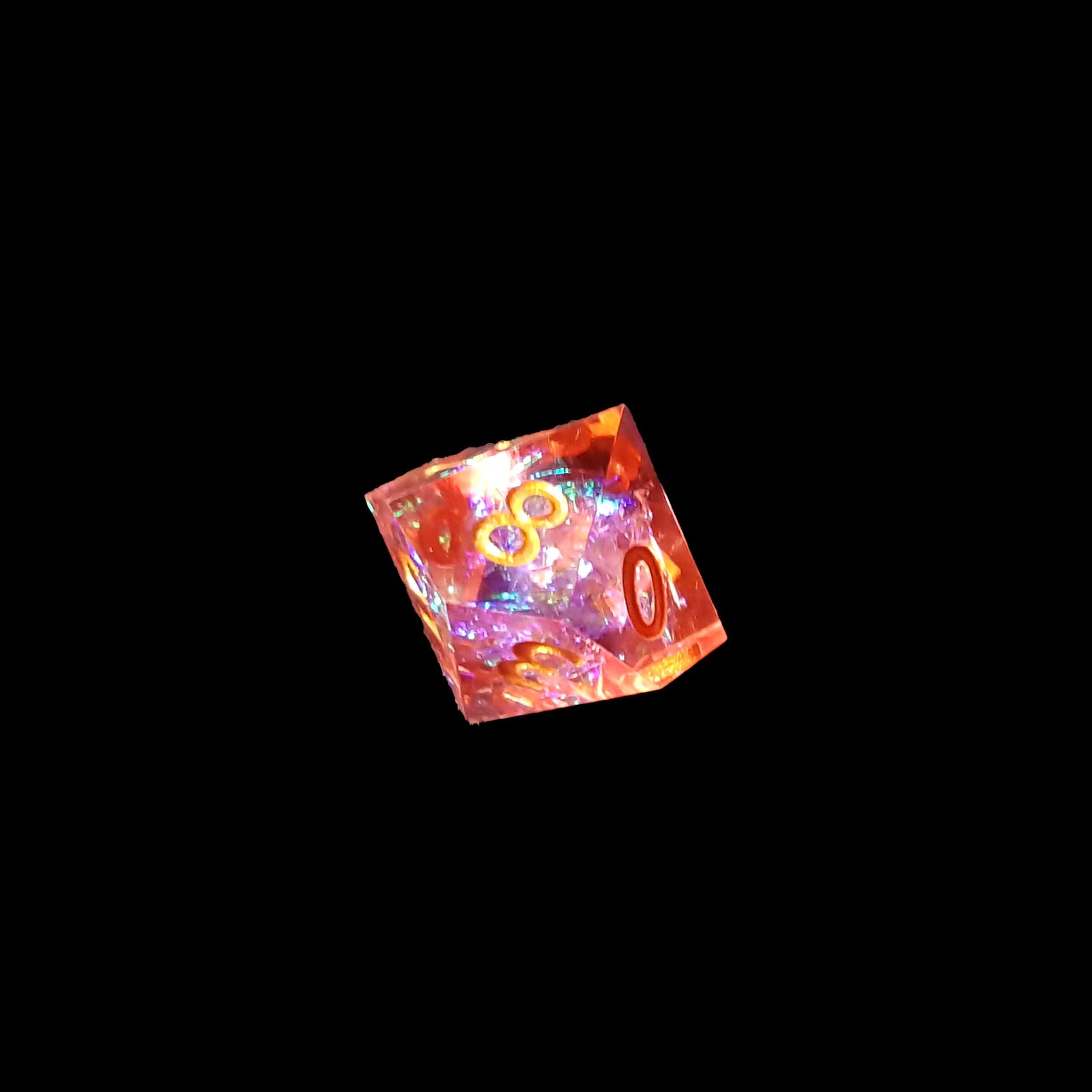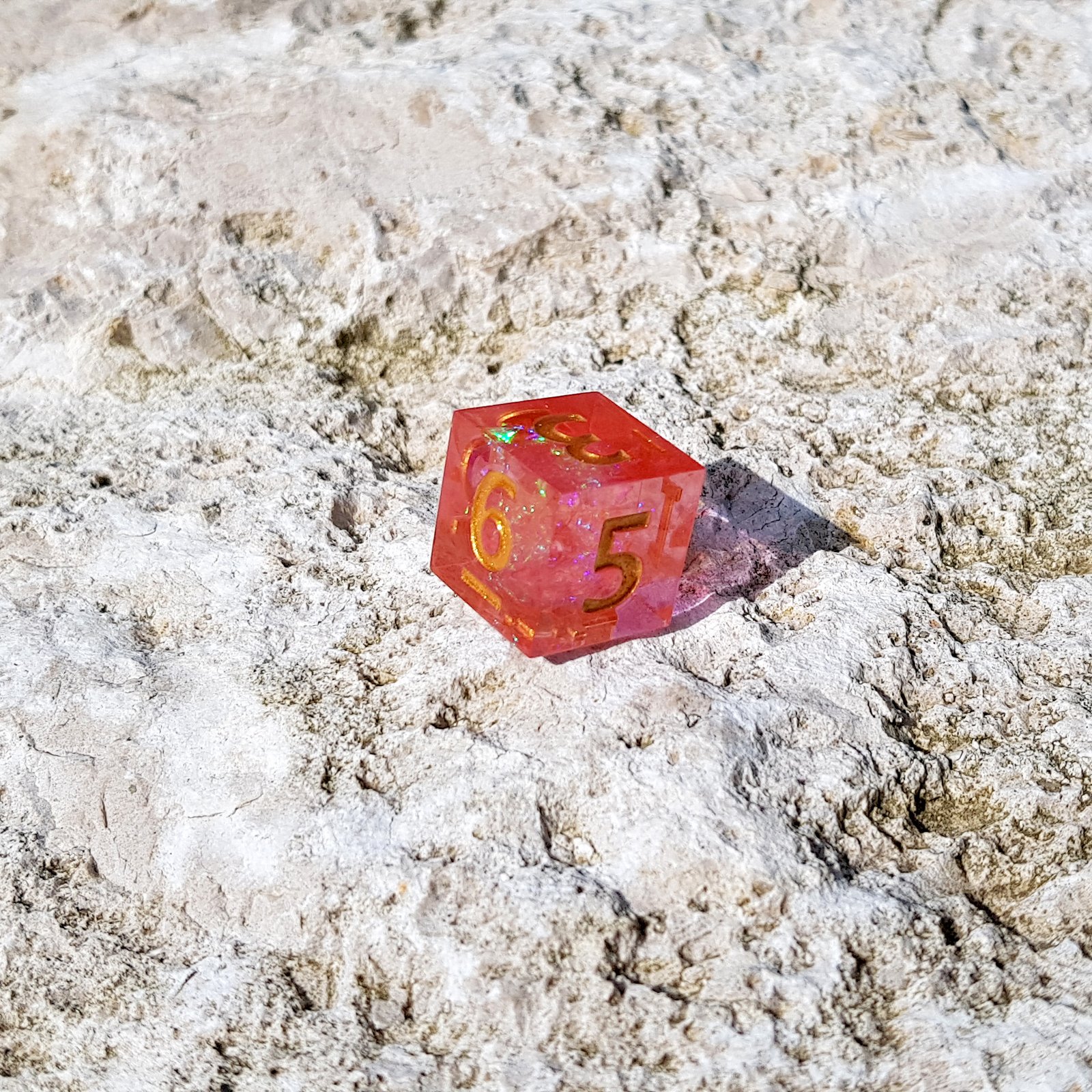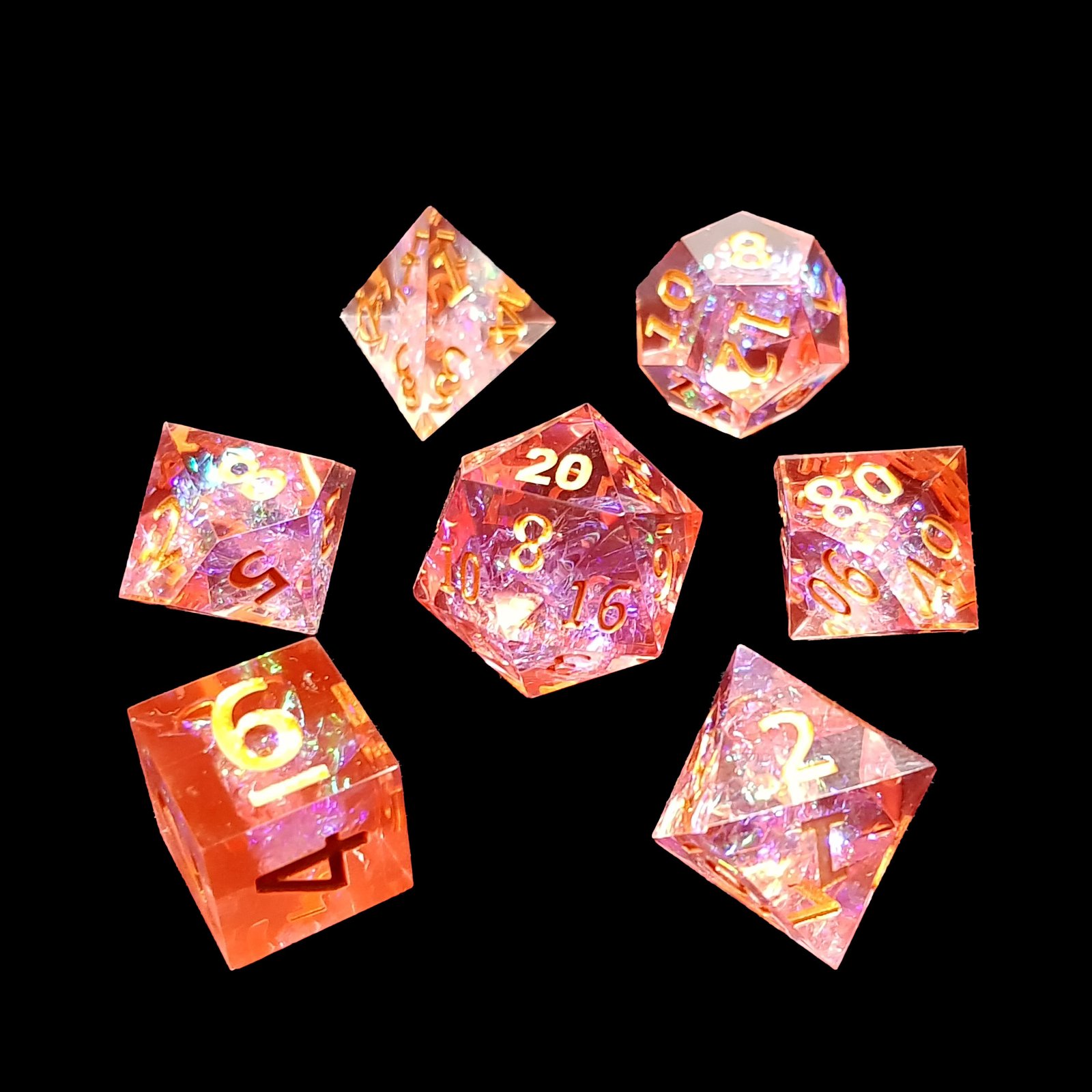 Within their luminous depths, iridescent flakes shimmer like pollen touched by firelight, shifting through soft pinks, radiant oranges, and flickers of enchanted gold. The golden numbering flows across each face with regal clarity, as if inscribed by a druidic artisan who captured spring and flame in a single breath.
