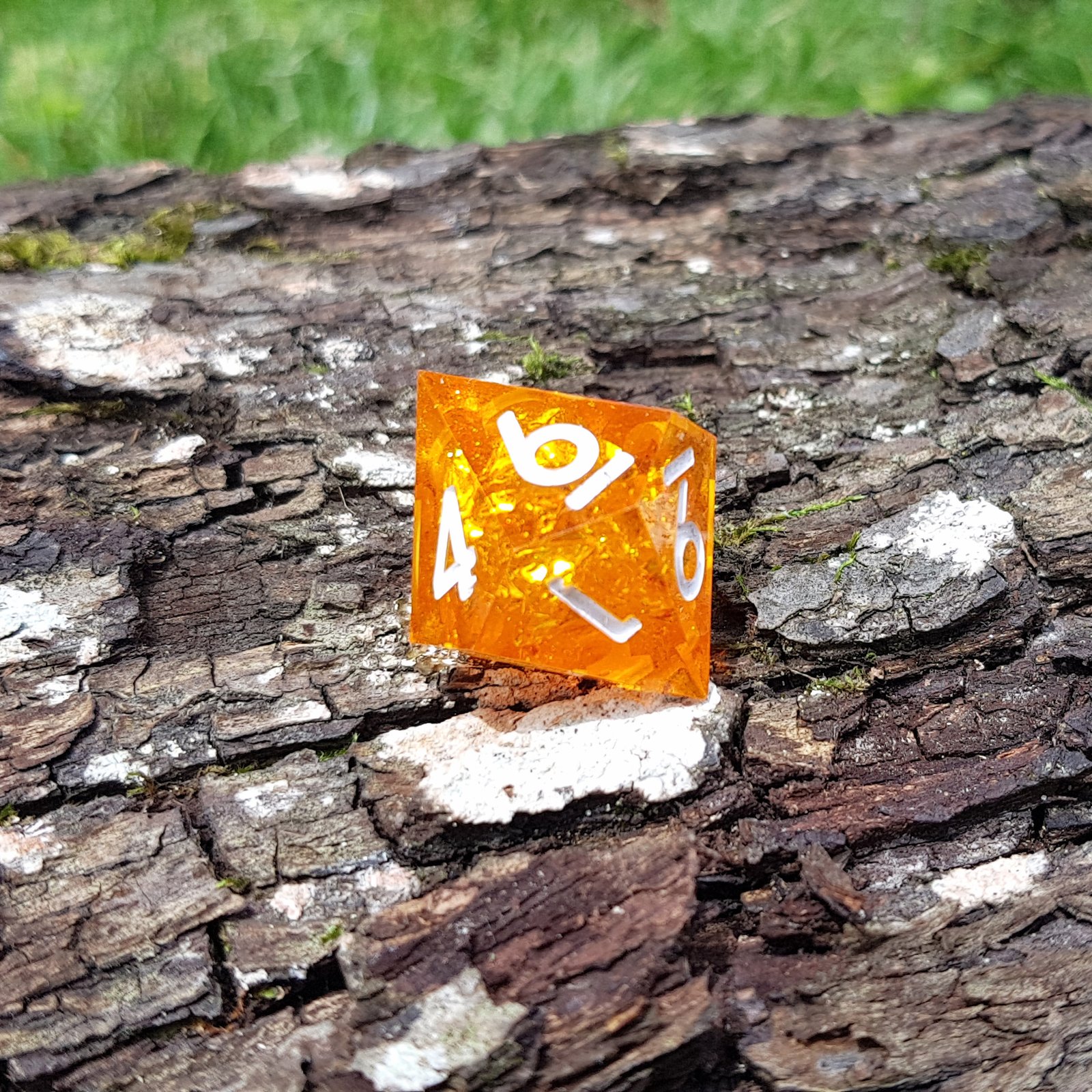 Said to be born from the cooling heart of a forge that once burned with the breath of fire giants, the Emberforge Shards dice set glows with the fierce brilliance of living flame. Each die is sculpted from razor-cut resin, clear as molten glass yet blazing with vibrant orange fragments suspended within—like splinters of sunlight trapped at the moment of impact.