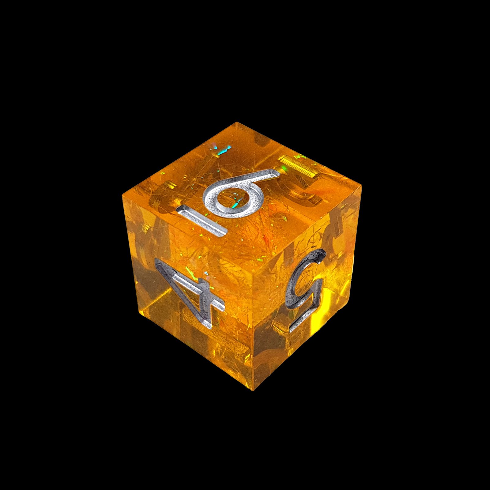 The interior shimmers with ember-bright flecks that spark and dance as you move them, echoing the energy of steel hammered beneath a master smith’s relentless rhythm. Their stark white numbering stands boldly against the fiery core, ensuring that even in the heat of battle, every result is unmistakable.