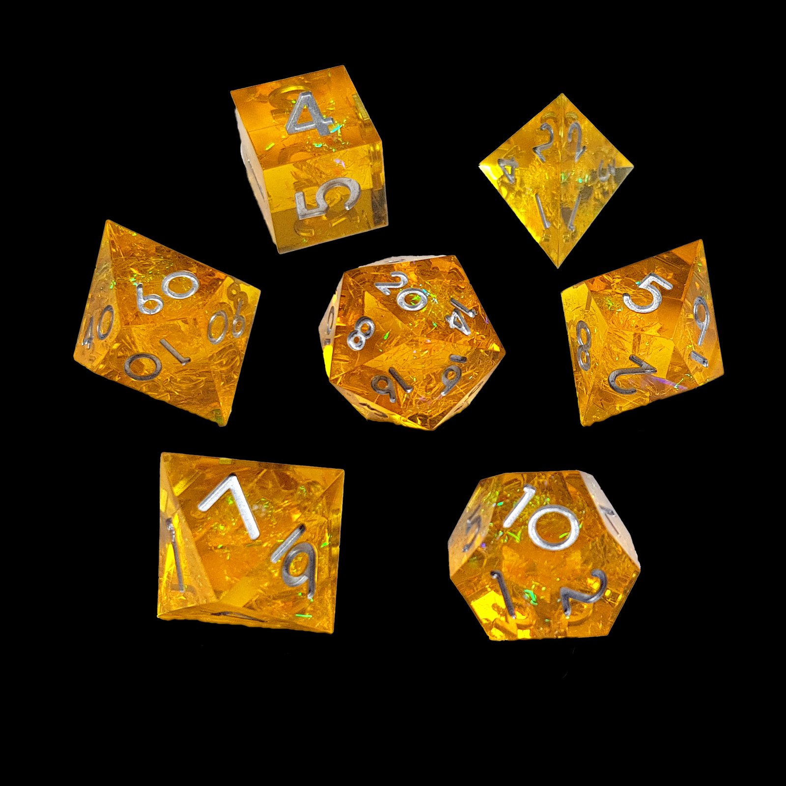Includes: D4, D6, D8, D10, D%, D12, D20, each infused with brilliant ember fragments that seem to ignite whenever the dice are turned in the light.