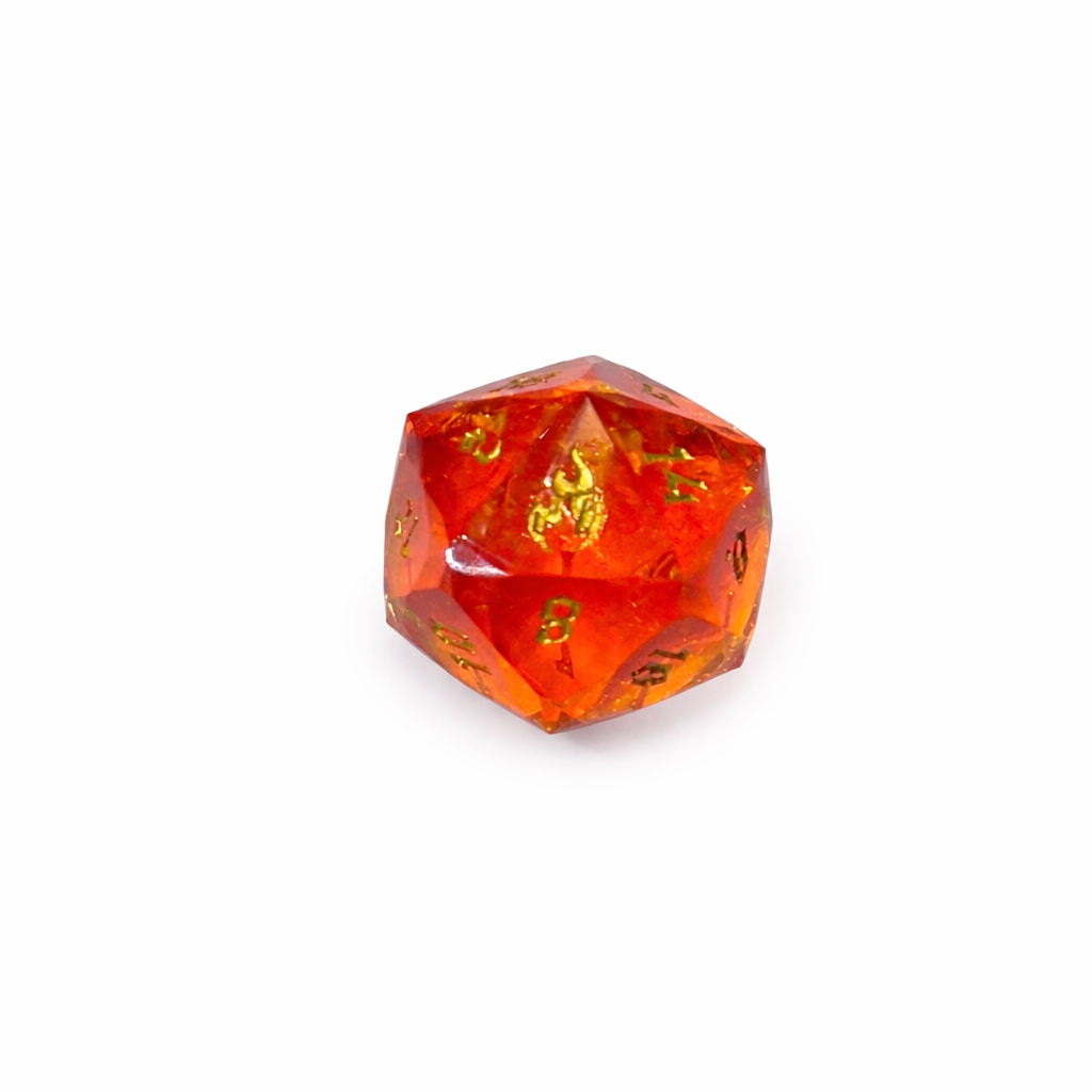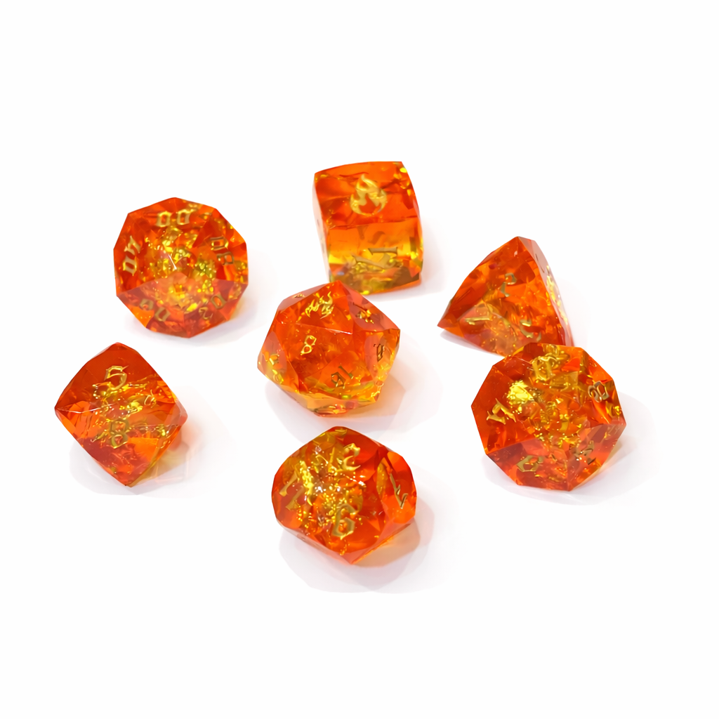Includes: D4, D6, D8, D10, D%, D12, D20 – Beauty born from geometry. Both the d20 and the d6 bear a flame symbol in place of the highest number.