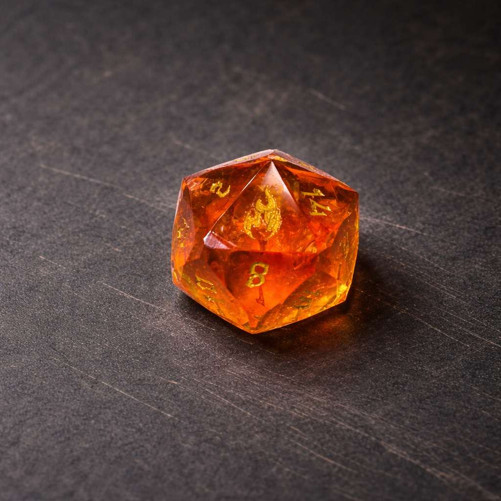 Blazing translucent amber-orange resin forms each sharply faceted die, glowing like liquid fire caught mid-pour. Within the depths, golden particulate shimmers like suspended embers, shifting as the light moves — a tiny furnace sealed inside crystal. The gold numbering doesn’t merely contrast; it fuses visually with the molten tones, as if etched by heat itself.