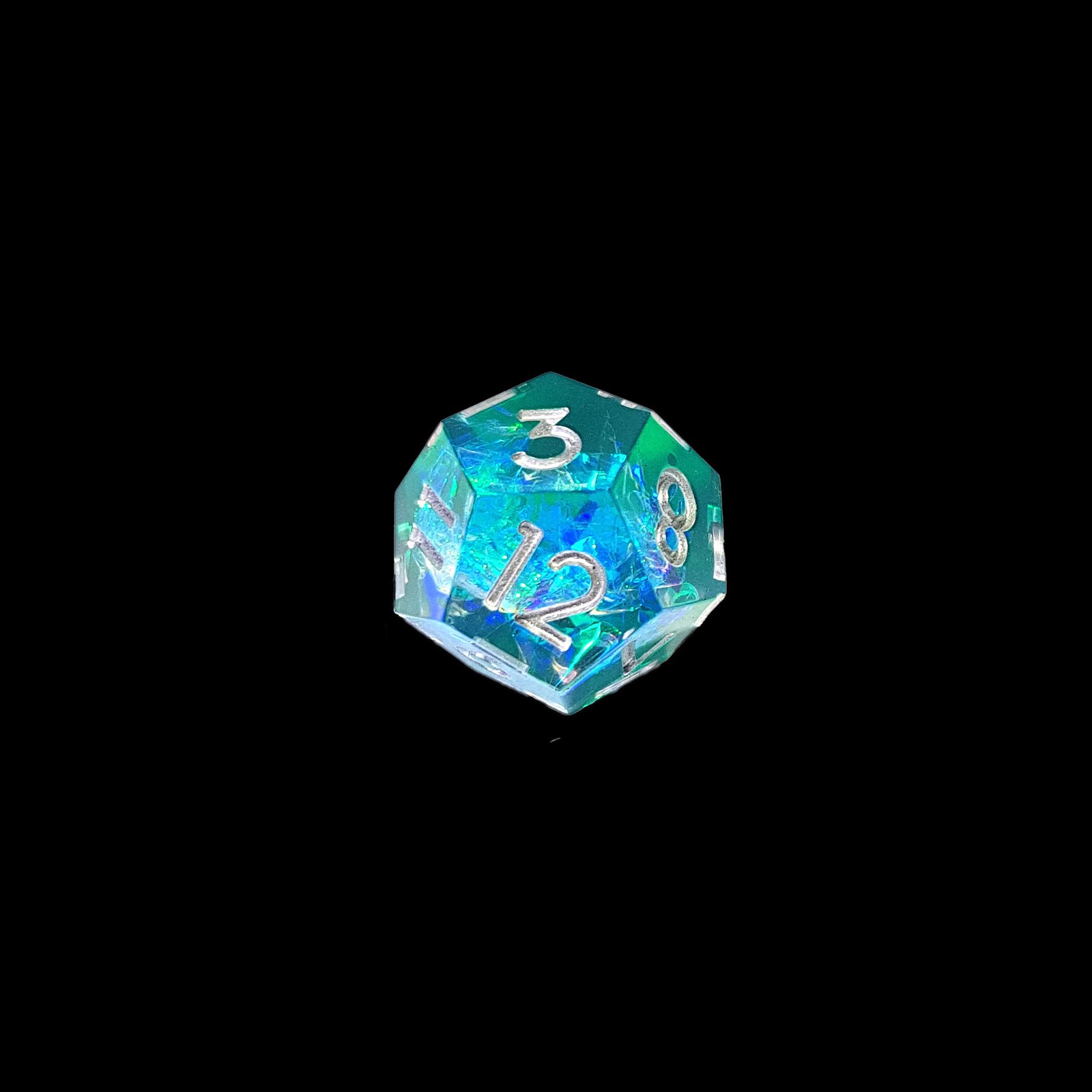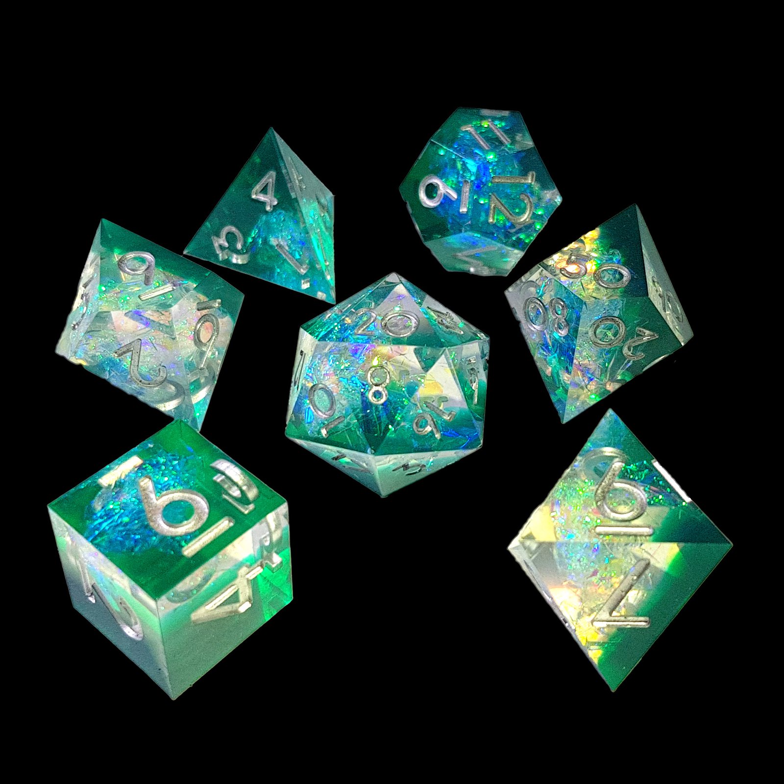 Includes: D4, D6, D8, D10, D%, D12, D20, each infused with iridescent frost-shards that shimmer differently with every shift of light.