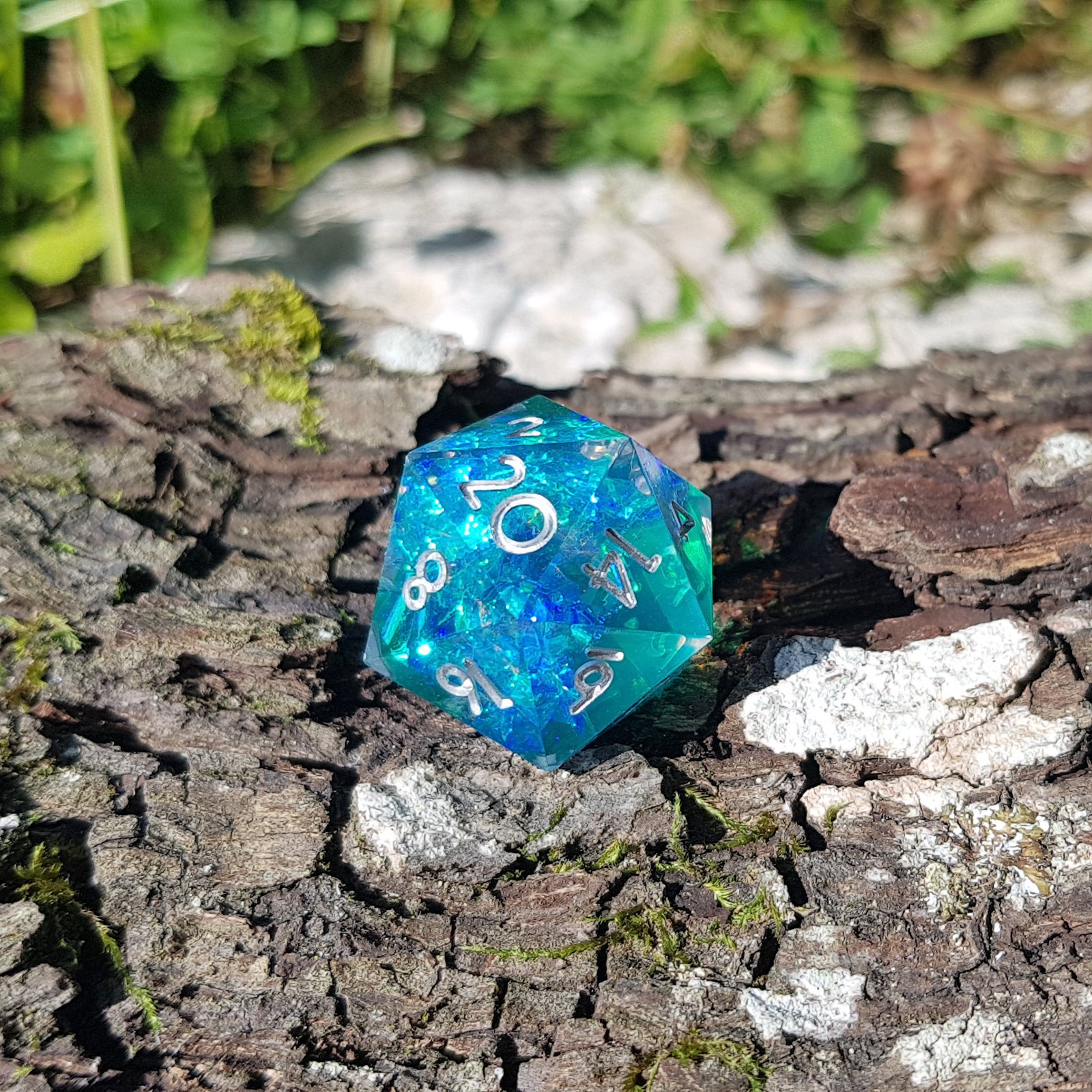 Said to be sculpted from the frozen surge of a magical tide, the Frostwave Crystals dice set gleams with the brilliance of icy waters struck by sunlight. Each die is carved from flawless, razor-edged resin blending glacial blues and shimmering turquoise, as though a cresting wave had been flash-frozen at the height of its beauty.