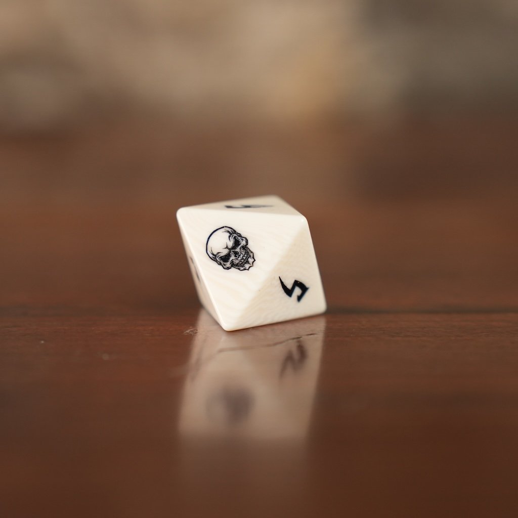 The color is warm and consistent, closer to aged parchment than bright white. Fine black engravings provide strong contrast, and the skull motifs, placed instead of the highest number, are clean and precise without feeling decorative for the sake of it.
