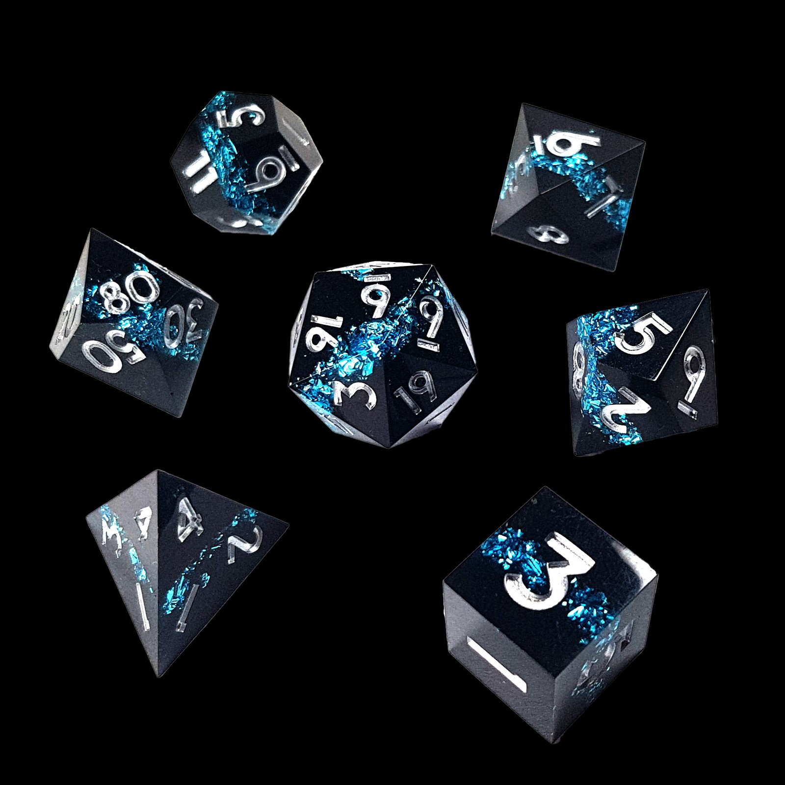 There’s a certain kind of magic that hides in the cracks of the world—the sort that shimmers only when moonlight hits volcanic stone just right. This set captures that secret glow. Midnight-black resin forms the base, as dark and dense as cooled obsidian, while a vein of bright azure crystal seems to cut through each die like a living river of arcane energy.