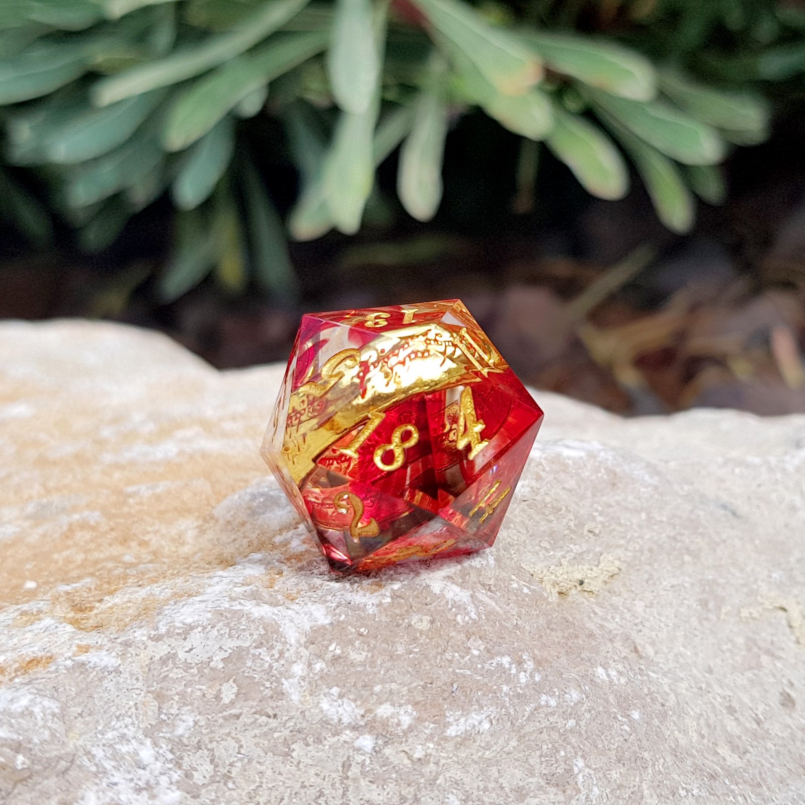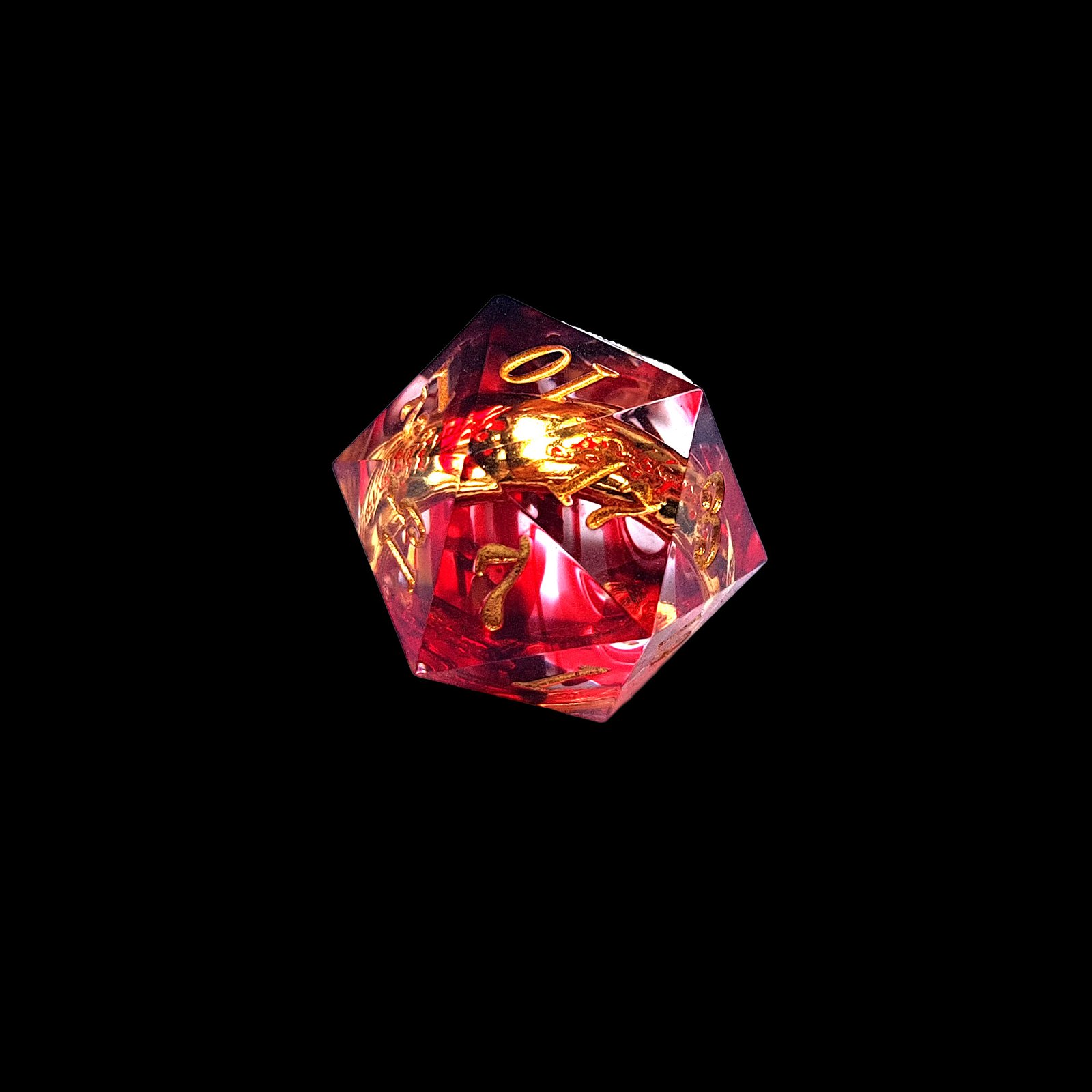 These dice look as if they were pulled straight from the heart of a dwarven forge—still glowing with heat, still humming with ancient craftsmanship. Each sharp-edged resin die holds a molten blend of ember-red, with a shining gold ring embedded in its center. As if just struck by a master smith’s hammer, the golden ring rests dormant in its seat, forged to endure ages and battlefields alike.