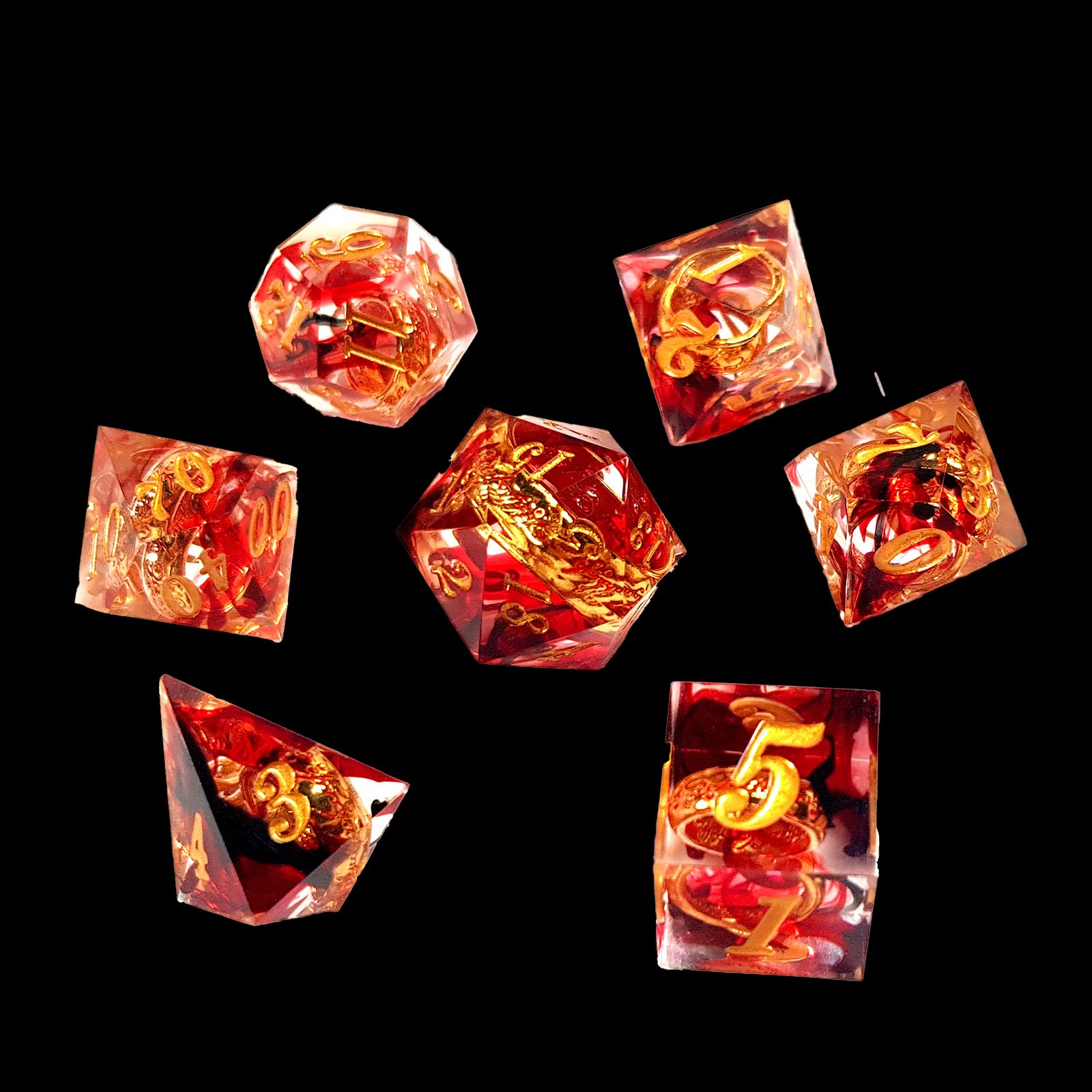 Includes: D4, D6, D8, D10, D%, D12, D20, with each die carrying a golden ring that gleams among the fire as if in lava.