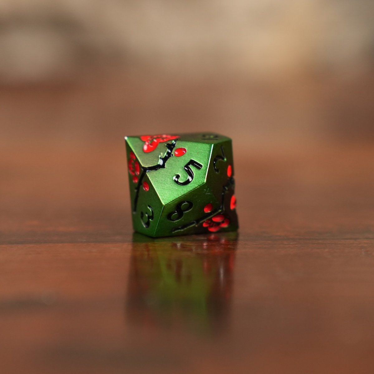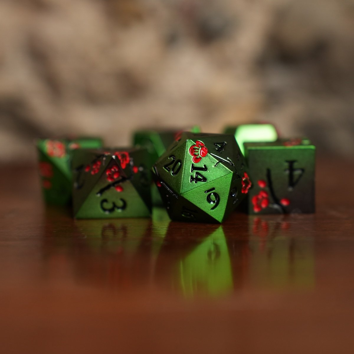 Across the emerald surface, crimson blossoms flare like living embers. Dark branches wind from face to face, as though the dice themselves were carved from enchanted wood still touched by spring. The black numbering rests clean and deliberate against the green, steady and resolute amid the bloom.